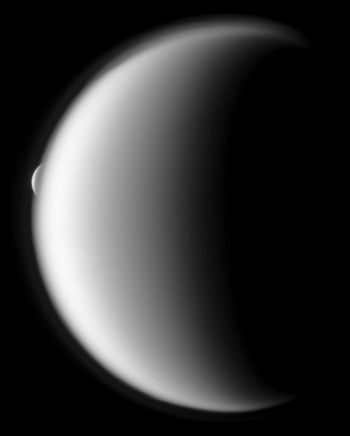 Secondly is the different between the edge of the moons – it’s fuzzy for Titan but is sharp for Rhea. The fuzzy edge for Titan is due to its thick atmosphere, which is clearly visible here with high altitude detached haze layer. Rhea has no atmosphere thus the boundary is sharp.