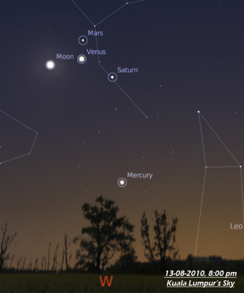 The best part of this conjunction is that you do not need any telescopes or binoculars to enjoy it. All the planets and the Moon are bright enough to be easily visible to the naked eye. You can also set up a camera to capture the event. It’s quite simple actually, just mount your camera to a tripod, aim and shoot. You can do it even with a compact camera, not necessary an SLR camera, as long as the camera allows you to play around with its setting.
