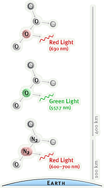 Oxygen is unusual in terms of its return to ground state after excitation: it can take three quarters of a second to emit green light and up to two minutes to emit red. However, collisions with other atoms or molecules will absorb the excitation energy and prevent emission. At the top of the atmosphere, there has a higher percentage of oxygen and it is sparsely distributed such that collisions are rare. This allows time for oxygen to emit red. Collisions become more frequent progressing down into the atmosphere, so that red emissions do not have time to happen thus only green is visible, and eventually even green light emissions are prevented at even lower altitude.
