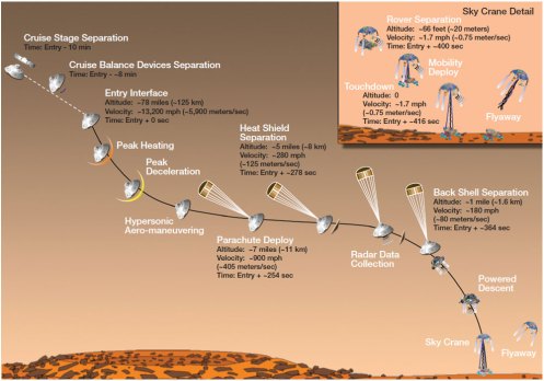 Before Curiosity can explore Mars, she will have to land safely. And since she is too heavy to use airbag, as the previous rovers did, engineers had to design a unique landing system to deliver her safely on the ground. It includes a sequence of steps that we could not control or even witness in real time because signals take 14 min to reach Earth from Mars. All will be done by the onboard computer. This 7-minute of terror from Mars atmospheric entry to touchdown include a heat shield, a huge parachute, retro-rockets and a sky crane to slow her from over 13,000 MPH to 0 MPH. Hundreds of things have to go just right.