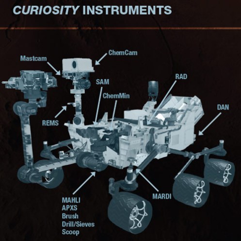 Curiosity carries a variety of science payloads to conduct a comprehensive search for signs of life, which includes remote sensing, contact instruments, analytical laboratory and environmental characterisation.